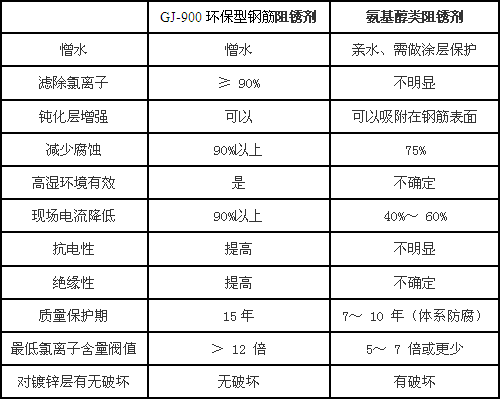 GJ-900環(huán)保型鋼筋阻銹劑與氨基醇類阻銹劑比較: