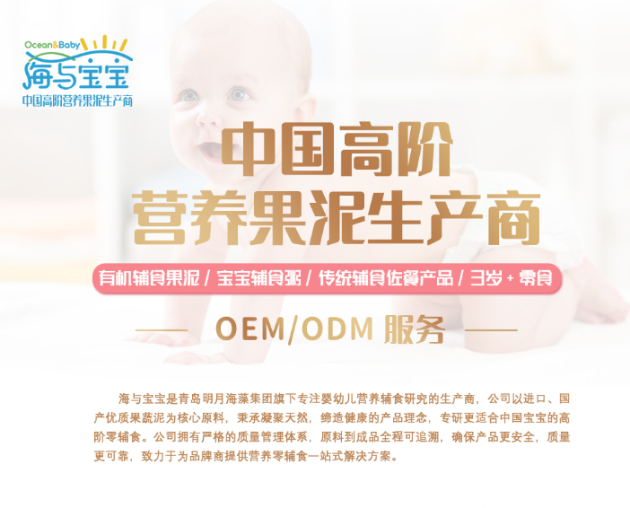 海與寶寶是青島明月海藻集團旗下專注嬰幼兒營養輔食研究的生產商,公司以進口、國產優質果蔬泥為核心原料,秉承凝聚天然,締造健康的產品理念,專研更適合中國寶寶的高階零輔食。公司擁有嚴格的質量管理體系,原料到成品全程可追溯,確保產品更安全,質量更可靠,致力于為品牌商提供營養零輔食一站式解決方案。