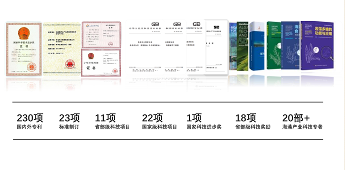 明月海藻集團獲得國內外專利 230 項,主持和參與制訂各類行業、國家標準 23 項,承擔省部級科技項目 11 項,國家級科技項目 22 項;獲國家科技進步獎 1 項,省部級科技獎勵 18項;出版海藻產業科技專著 20 余部。